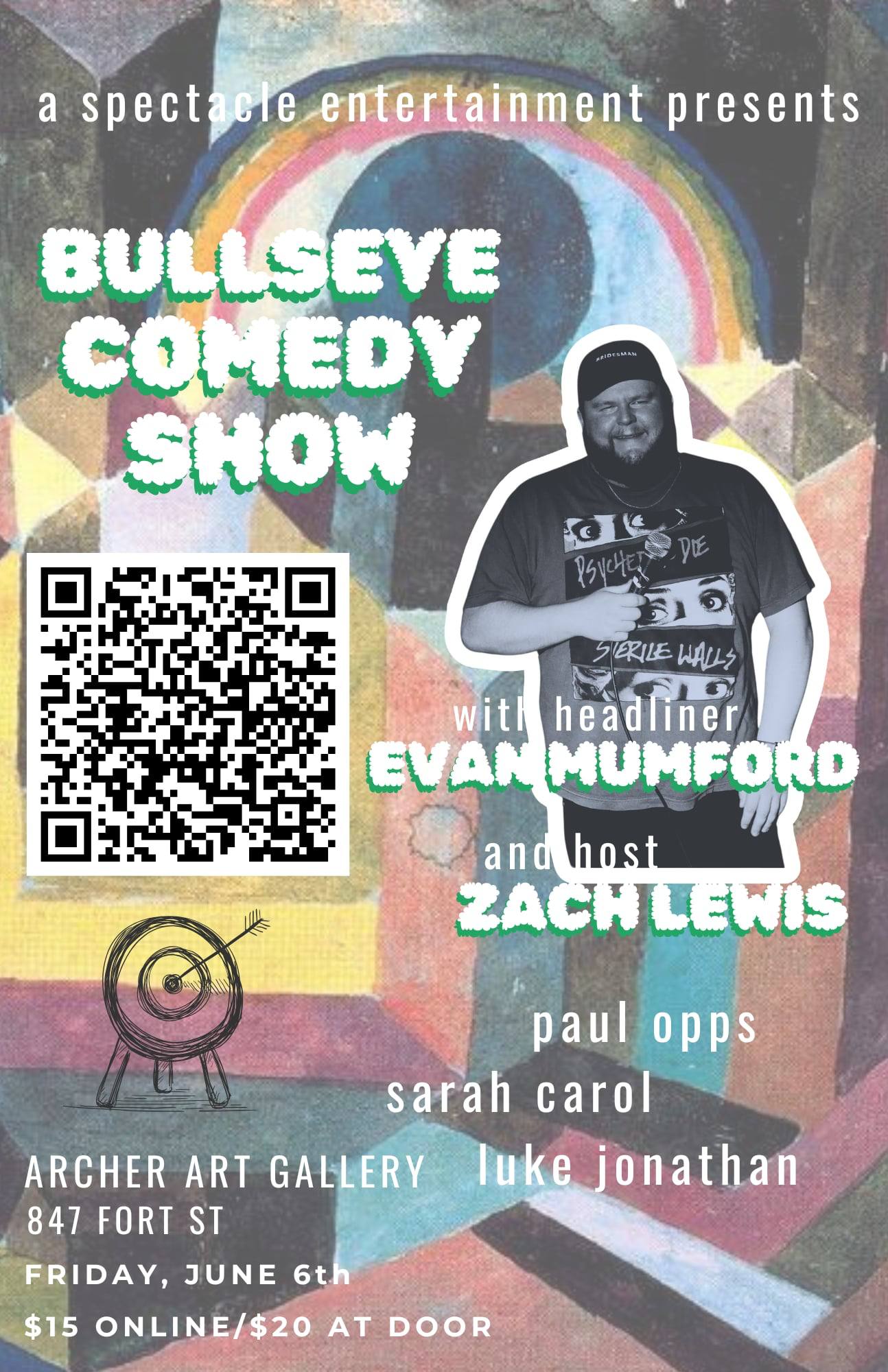 $15.00Come join us for a night of laughter at the Archer Mural Artist Art Gallery! Bullseye Comedy Show features some of the funniest comedians From Vancouver and Victoria ready to make you laugh until you cry. Our headliner, the absurd Evan Mumford, has featured at the Halifax Comedy Festival, Vancouver Just For Laughs and his most recent special on Youtube”Evan Mumford Burns Everything”. This show also showcases three great comics from Victoria and Vancouver ready to bring the house down. Grab your friends and get ready for a hilarious evening filled with jokes, stories, and plenty of good vibes. Don’t miss out on this unforgettable event – get your tickets now! Doors are at 7, show starts at 8 and seating is first come, first serve so come early!