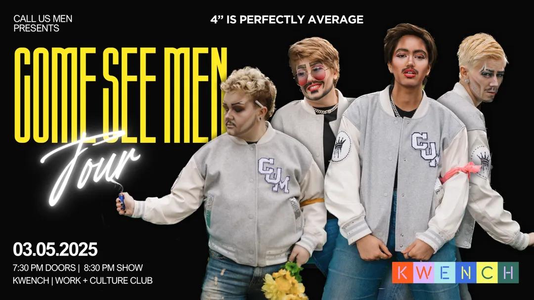 $20 – $30Join the heartthrobs of Call Us Men, the drag king boyband turning stages into stadiums, for the FINAL and most fabulous stop on their Come See Men Tour! It’s all going down on May 3rd at KWENCH, and you won’t want to miss this high-energy, jaw-dropping, gender-bending spectacle of talent, testosterone, and tear-away pants.