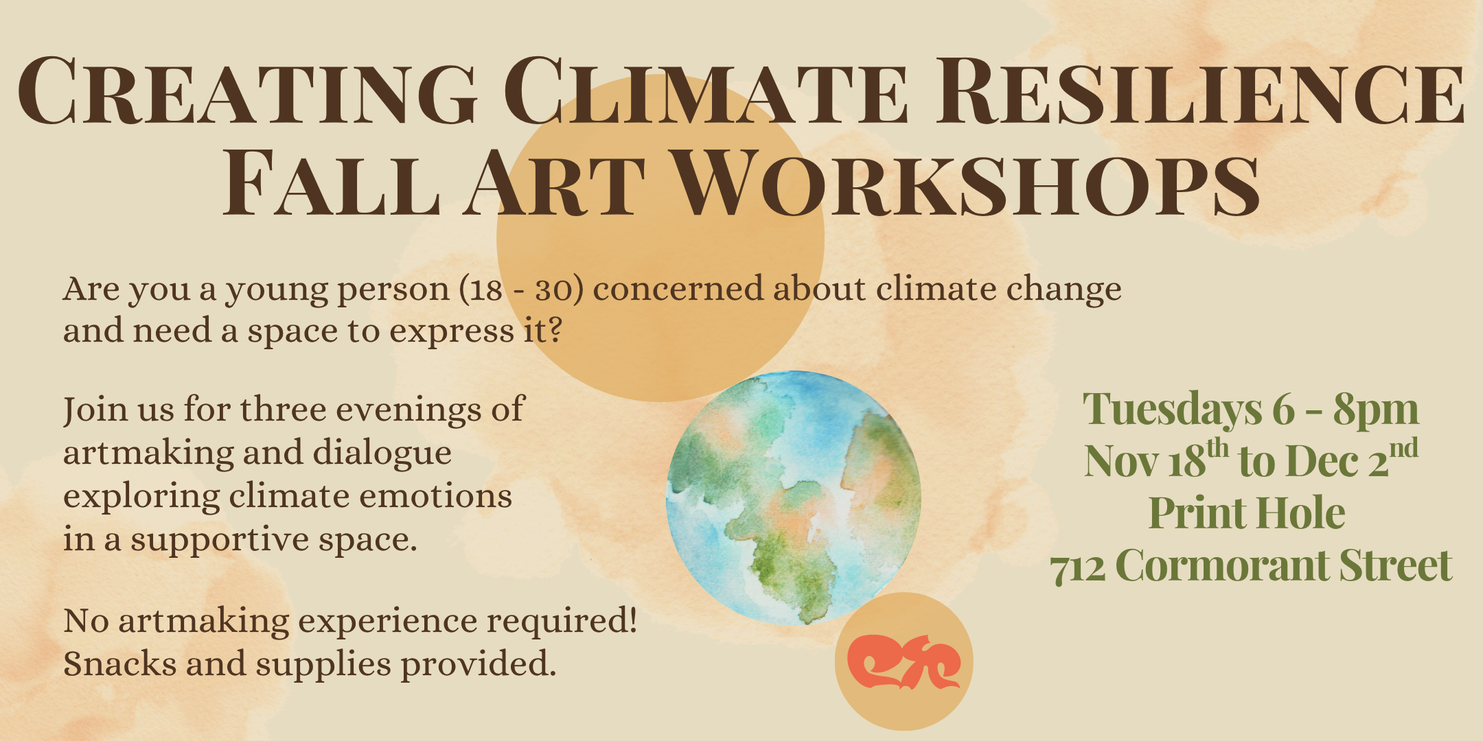 Join Creating Climate Resilience for a Tuesday evening workshop series utilizing artmaking and dialogue to explore your thoughts and feelings about climate change in a supportive space. Creating Climate Resilience is a community initiative aiming to cultivate people’s emotional resilience to climate impacts through relationship building, knowledge mobilization and art workshops. Over this series of three art workshops we will explore such themes as how climate change feels in our bodies, how we can respond to ecological grief and climate anxiety, and our visions for what a climate resilient future could look like. This is a safe space to create ‘bad art’ to process your climate emotions. No prior artmaking experience or expertise about climate change is required. Snacks and supplies provided!