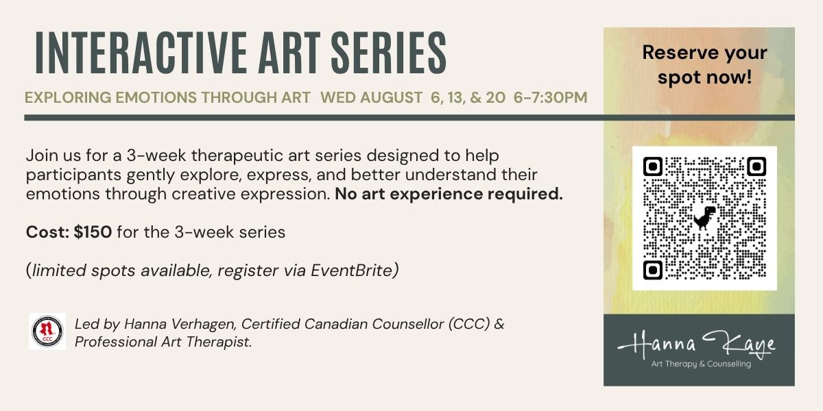 ? Reserve your spot for free – Hanna Kaye Art Therapy & Counselling will follow up by email with paperwork & payment options.