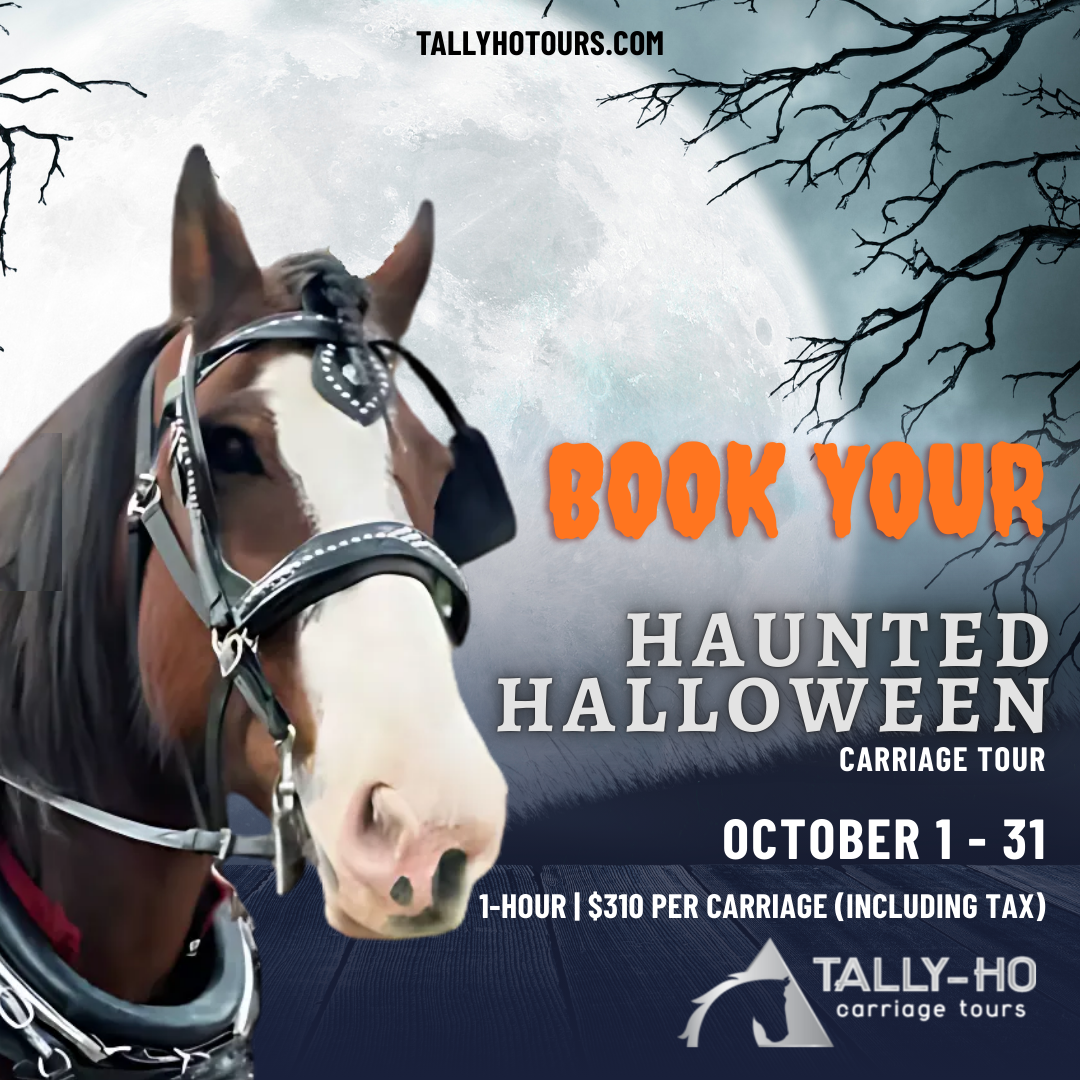 Your professional guide brings Victoria’s haunted history to life with thrilling storytelling, all while you ride in comfort behind a beautifully adorned draft horse — dressed for Halloween and protected with traditional brasses and ribbons said to ward off evil.