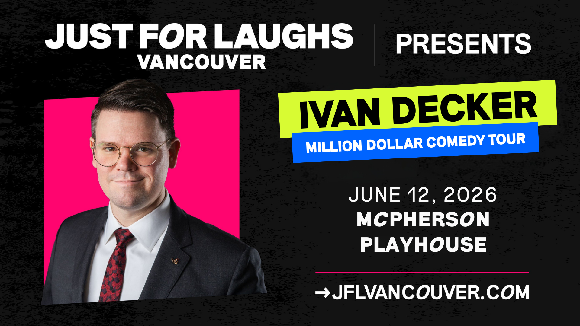His sharp wit and impeccable timing have earned him a JUNO Award win, a Netflix half-hour special, and appearances on CBC, CTV, TBS, CONAN, The Debaters, and Just For Laughs, along with headlining spots at festivals across North America and Europe. Chortle Magazine UK calls his comedy “smart, original, and slick,” and we couldn’t agree more — Just For Laughs VANCOUVER is proud to present Ivan Decker live across Western Canada.