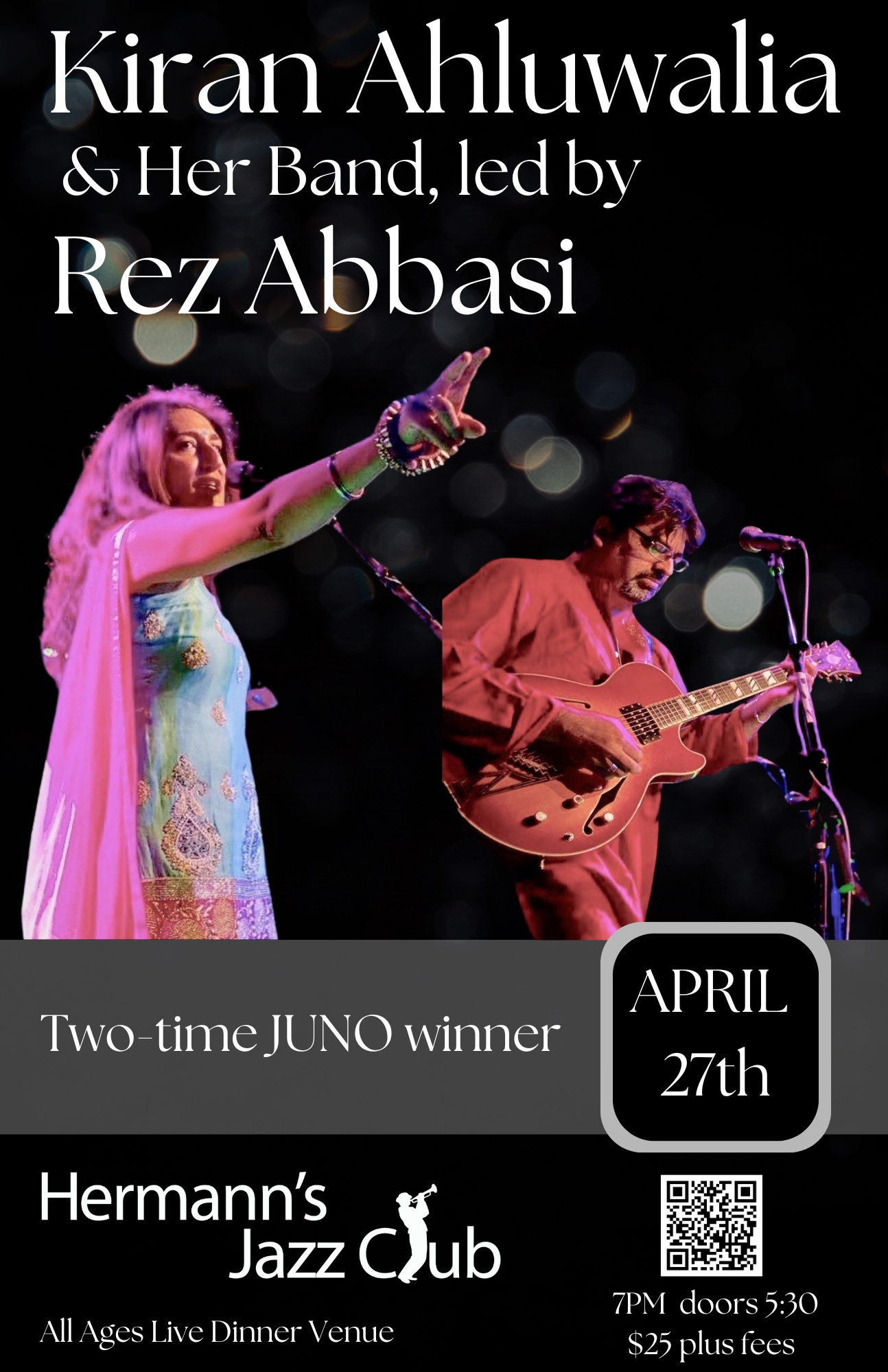 Ahluwalia’s four-piece band includes guitar, tabla, accordion/organ, and drums. At the helm of the group isPakistani-American virtuoso guitarist Rez Abbasi. Kiran and Rez are a real-life couple, one born in India, the other in Pakistan. Having grown up in the Diaspora they crossed ethnic and religious lines between their two warring motherlands and embody the idea that art knows no borders, using their music to dissolve divisions and create profound human connections.