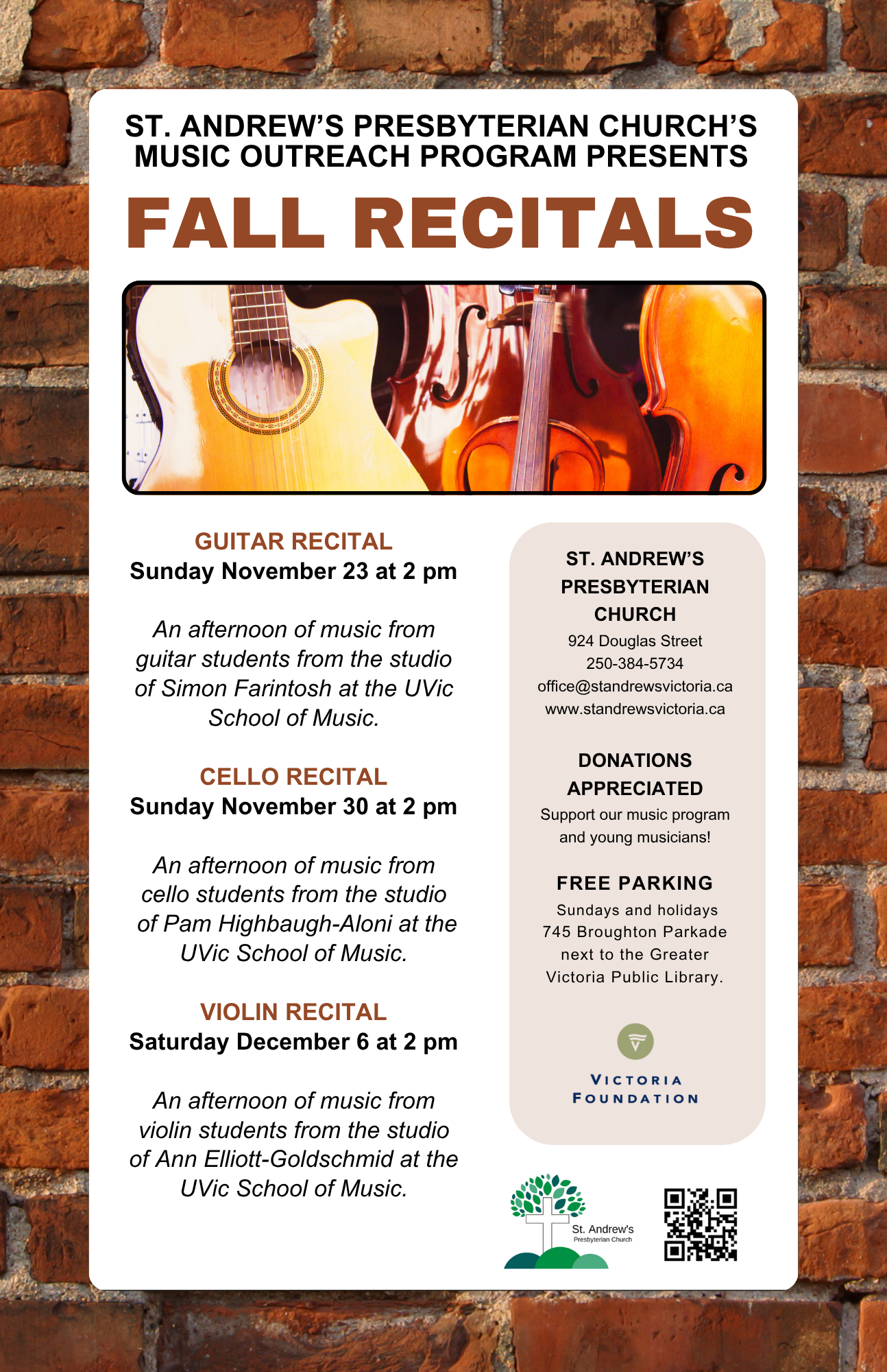 FreePresented by St. Andrew’s Music Outreach program on Saturday, December 6 at 2:00 pm at St. Andrew’s Presbyterian Church. An afternoon of music from violin students from the studio of Ann Elliott-Goldschmid at the UVic School of Music. Entrance is by donation and everyone is welcome.