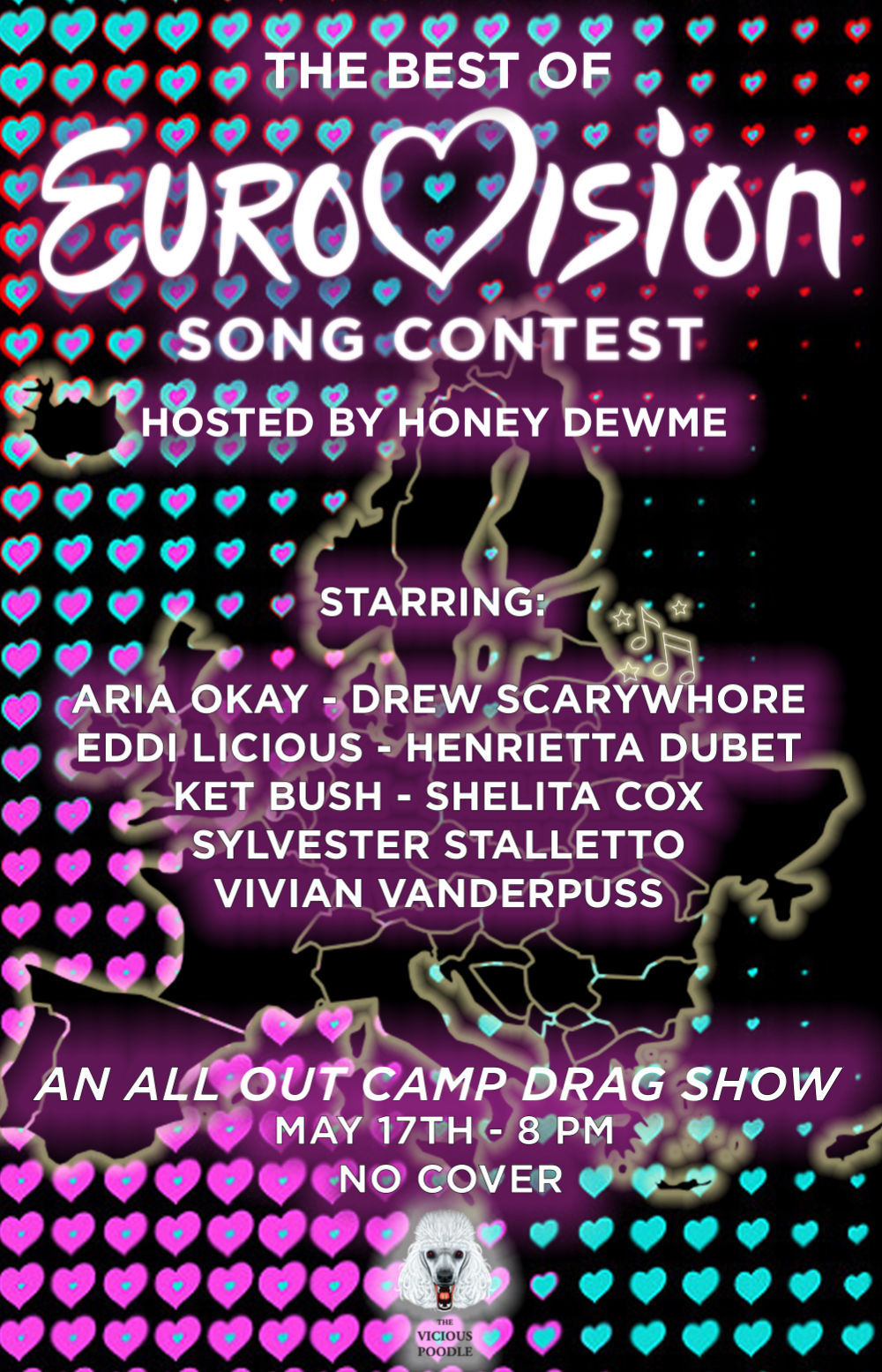For the first ever time in Victoria drag history, we are throwing an all-out Best of Eurovision show at the Vicious Poodle on May 17th, at 8 pm! And the best of all: NO COVER!