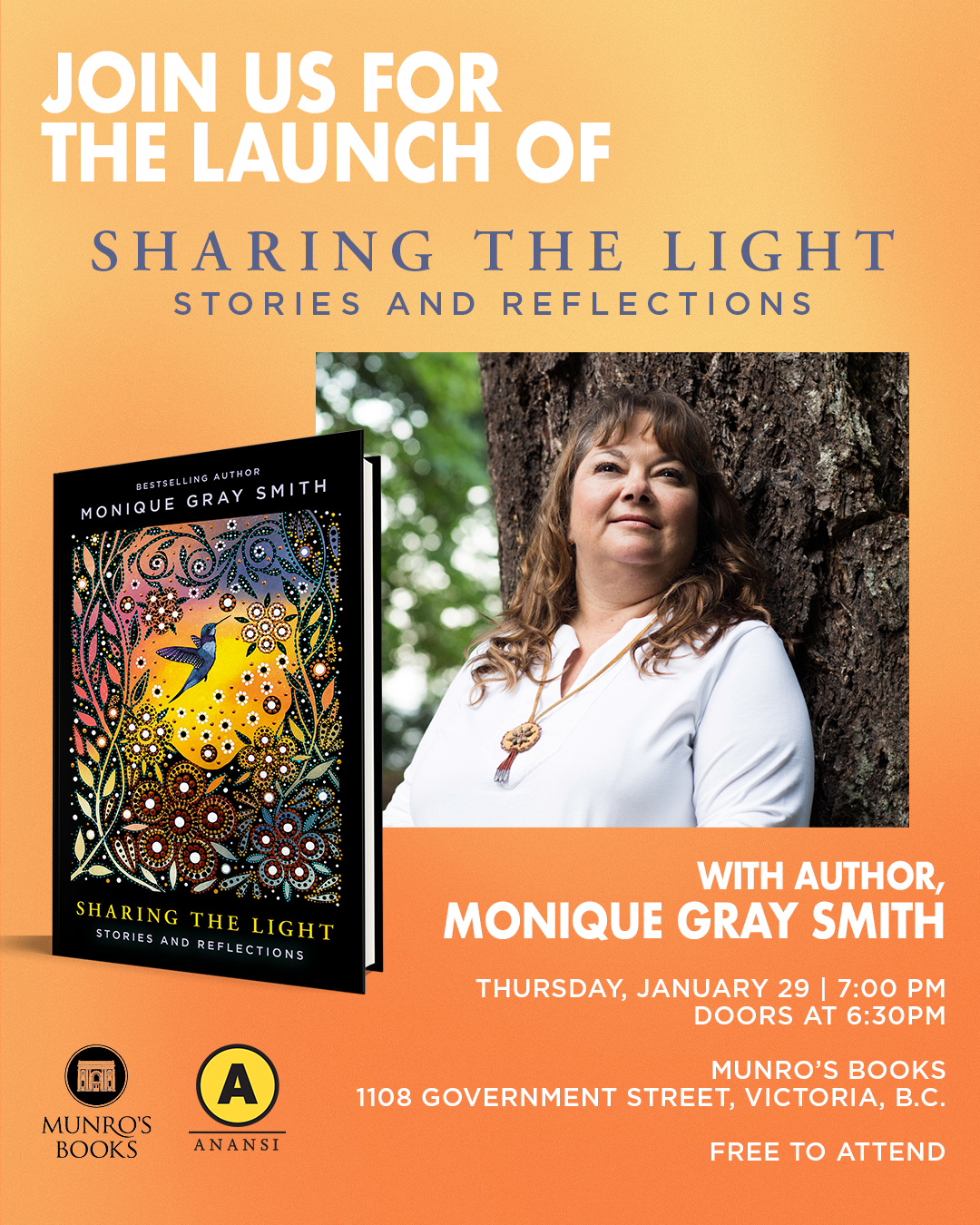 Join us for the launch of Monique Gray Smith’s new book, Sharing the Light: Stories and Reflections ! A collection which inspires gratitude, love, joy, and hope in navigating life in a changing, challenging world.